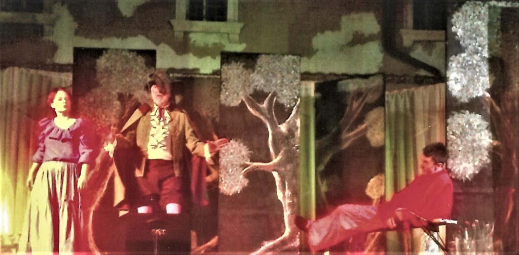 L’azione è interamente ambientata in un parco, realizzato teatralmente: quindi con spezzati dipinti che rappresentano un certo intrico di alberi. Il bosco è in piena fioritura, ma i tronchi sono scuri talora inquietanti. Con questa alternanza di chiaro/scuro, nero/colore si è voluta rendere appunto l’idea d’un amore, “croce e delizia”, “gioia e pena” della nostra vita.